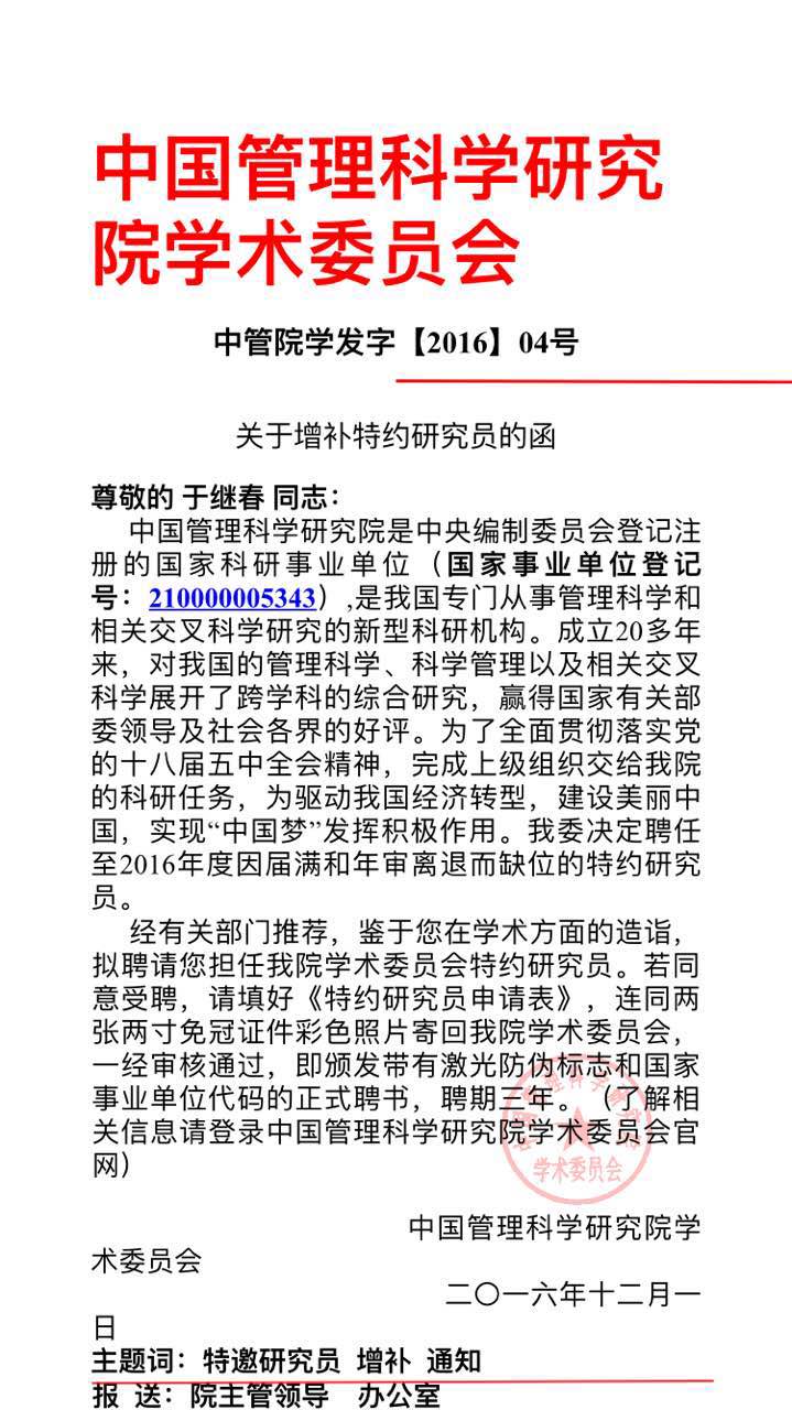 2017年1月5日河南继春律师事务所主任于继春收到中国管理科学院学术委员会受聘作为该院特邀研究员的函件,以下为函件:
